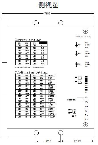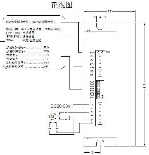 注:可根據(jù)客戶要求定制細(xì)分?jǐn)?shù)! !注意 1、輸入電壓不能超過(guò)DC50V; 2、輸入控制信號(hào)電平為+5V-+28V范圍,高于+5V時(shí)無(wú)需外接限流電阻; 3、輸入脈沖信號(hào)下降沿有效; 4、驅(qū)動(dòng)器溫度超過(guò)80度時(shí)驅(qū)動(dòng)器停止工作,故障指示燈ALM亮,直到驅(qū)動(dòng)器溫度降到50度時(shí),驅(qū)動(dòng)器需要重新上電才能恢復(fù)工作。出現(xiàn)過(guò)熱保護(hù)請(qǐng)加裝散熱器; 5、過(guò)流(負(fù)載短路)故障指示燈ALM亮,請(qǐng)檢查電機(jī)接線及其他短路故障,排除后需要重新上電恢復(fù); 6、無(wú)電機(jī)故障指示燈ALM亮,請(qǐng)檢查電機(jī)接線,排除后需要重新上電恢復(fù)。 驅(qū)動(dòng)器接線、尺寸示意圖